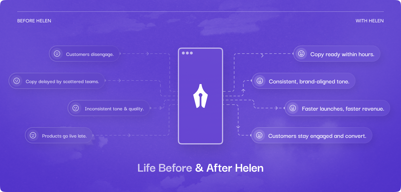 Helen transforms raw product data into conversion-ready copy within hours, helping you launch faster and sell sooner.